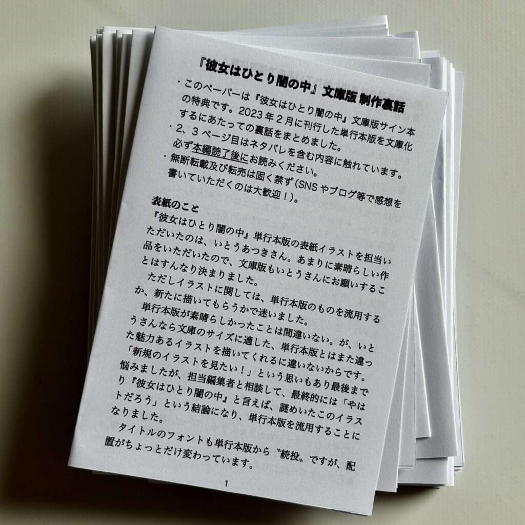 『彼女はひとり闇の中』文庫版の特典でつくった制作裏話。文庫サイズ4ページの冊子です。2、3ページ目は完全ネタバレ解説となっております。