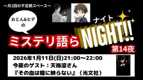 というわけで、おとんさんとヒデさんが不定期開催しているXのスペース「ミステリ語らNIGHT!!」にゲスト出演させていただきます。1月11日(日)21時から1時間程度。『その血は瞳に映らない』の話がメインになると思いますが、ほかにもいろいろとお話しさせていただく予定。